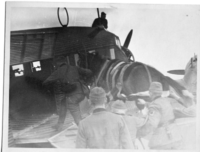 Störmede, Mai 1940:Eine Ju 52 der Kgr.z.b.V. 12 wird mit einem Pferd beladen, das mit den Soldaten des I.R. 65 (Luftlande - keine Fallschirmjäger!)im holländischen Kampfgebiet abgesetzt werden soll.